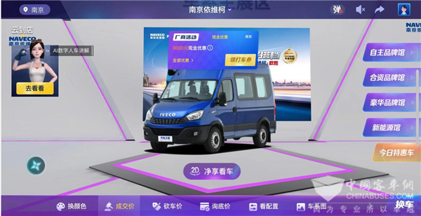 云车展期间,你不仅可以在依维柯云车展展台360度净享看车,前脸、轮毂、车厢……环绕式体验,每个车身细节一览无余。还可以享受现金促销、金融贴息、保险补贴、置换补贴、置换补偿保险、车载智慧消毒系统等超多购车福利。除此之外,你还可以在此平台查看成交价、在线砍车价、询底价、对比各种价格优惠,为你看车购车提供大便利。另外,若你想要前往你所在城市的线下门店,可在平台领取免费打车券,打车到店,免去了乘坐公共交通的困扰。