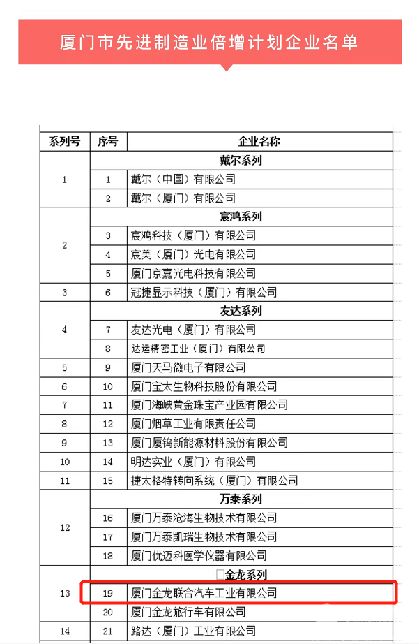 2022年4月,厦门市工业和信息化局公布了厦门市先进制造业倍增计划企业名单(第一批)予以公示,金龙客车荣登榜单。厦门市先进制造业倍增计划主要围绕产业规模、头部企业打造、重点产业企业培育等提出先进制造业发展目标,形成先进制造业规模倍增、供给提升、全面突破的良好发展态势。