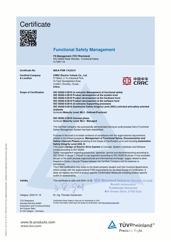 其实,早在2017年4月,中车电动便正式成立功能安全管理体系认证项目团队,负责功能安全管理体系建设、功能安全产品开发及相关认证工作,并于2018年,获取ISO26262功能安全管理体系ASIL-D ML2-管理级认证证书。