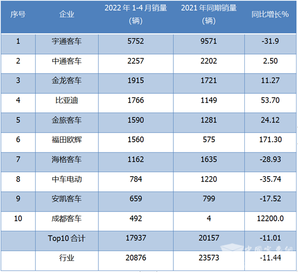根据中国客车统计信息网数据,2022年1-4月6米以上客车Top10排行: