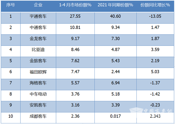 从上表看出,2022年1-4月新能源客车Top10中市场份额变化特征是: