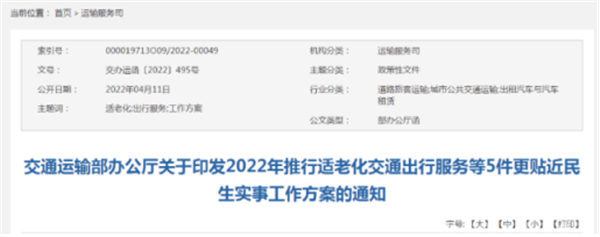 2022年4月11日,交通运输部官网印发了《2022年推行适老化交通出行服务等5件更贴近民生实事工作方案》,特别针对“低地板、低入口”公交推广数量,提高适老化交通出行服务做了重点布局,让近年来全民一直聚焦的适老化关怀有了更具体的执行方向和落脚点。