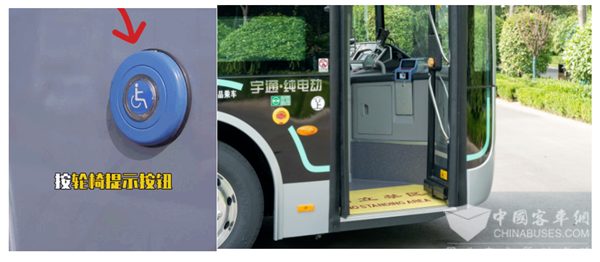 对老年群体的关怀是新款智能网联公交车宇通黑金刚U12的最大特点。作为一款为满足消费需求升级而打造的全新造型低地板纯电动高端公交车,针对老年人对公交线路依赖较大的特点,黑金刚U12公交车采用低地板结构设计,上下门的时候乘客门处仅设置一个台阶,同时具备整车自动升降功能,方便老人、妇幼、残疾人等上下车。步踏区域的黄色踏板则在面对轮椅乘客以及婴儿车乘客时可以“摇身一变”翻转为坡道,方便不便的乘客上下车。