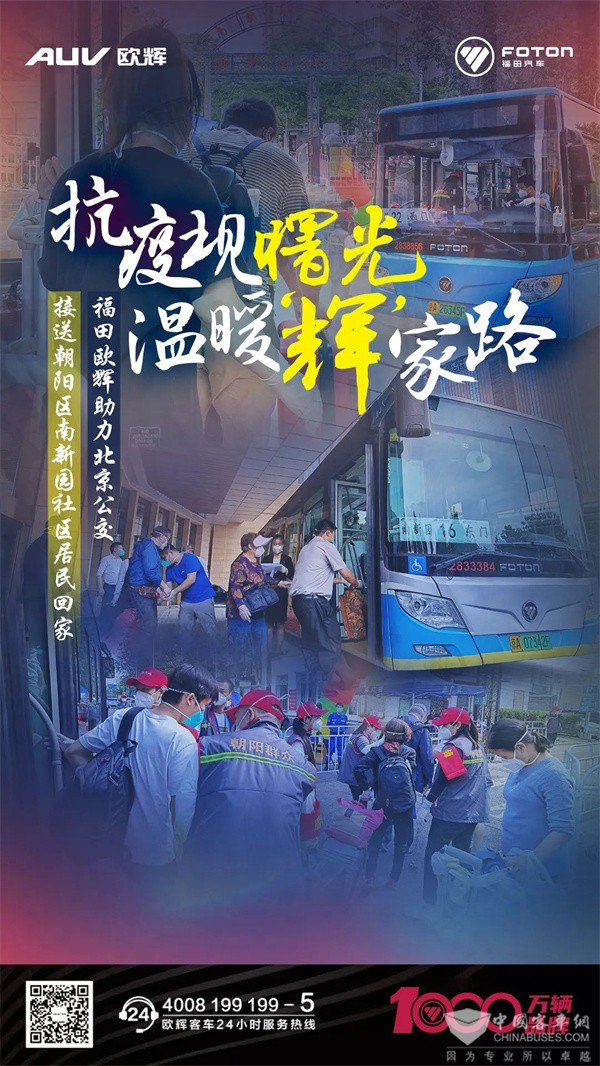 从2022年5月28日起,朝阳区南新园社区居民陆续结束集中观察,北京公交集团携福田欧辉客车承担了从集中观察点将居民们运送回社区的转运任务。
