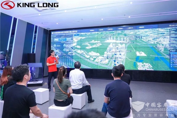 体验活动中,工程师们对数字孪生云控平台进行了说明讲解,带领嘉宾们感受到数字孪生的魅力。此次展示的数字孪生云控平台,是金龙客车按照小规模试点、高质量建设的原则,依托车路协同、云控平台和自动驾驶等技术,打造的基于数字挛生的软件园三期智慧交通云控平台。平台包含智慧道路、入网车辆、智慧公交、交通态势、车路协同和智慧应用等模块,实现对道路、车辆更加精细和智慧化管理,为交通出行提供更安全、更智能的决策。