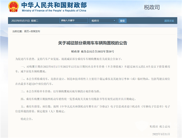 为促进汽车消费,支持汽车产业发展,2022年5月31日,财政部官网发布《关于减征部分乘用车车辆购置税的公告》,其中指出,对购置日期在2022年6月1日至2022年12月31日期间内,且单车价格(不含增值税)不超过30万元的2.0升及以下排量乘用车(9座及以下),减半征收车辆购置税。