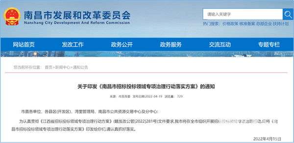 其中,今年4月初,江西印发《江西省招标投标领域专项治理行动方案》;4月15日又印发《南昌市招标投标领域专项治理行动落实方案》。而首批开展营商环境创新试点的6个城市,目前已全部发布当地营商环境创新试点工作实施方案。