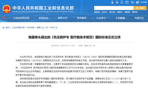 2022年6月15日,工信部发布消息,由我国牵头提出的《负压救护车 医疗舱技术规范》(ISO/TS17430)国际标准提案经国际标准化组织道路车辆委员会(ISO/TC22)投票表决正式立项。