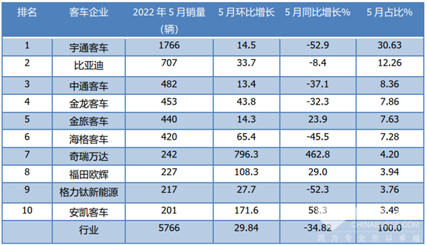 比亚迪榜眼 欧辉双增长 前十环比全涨 5月客车销量“银四”变“铁四”