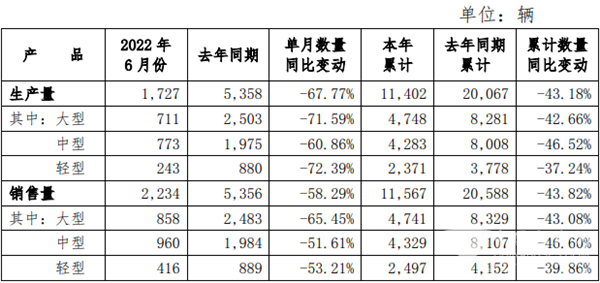2022年7月4日,宇通客车发布2022年6月份产销数据快报。数据显示,2022年6月,宇通共生产大、中、轻型客车1727辆,同比下降66.77%;共销售各型客车2234辆,同比下降58.29%。2022年1-6月,宇通累计生产各型客车11402辆,累计销售各型客车11567,较去年同期分别下降43.18%和43.82%。