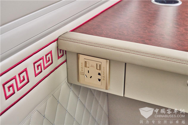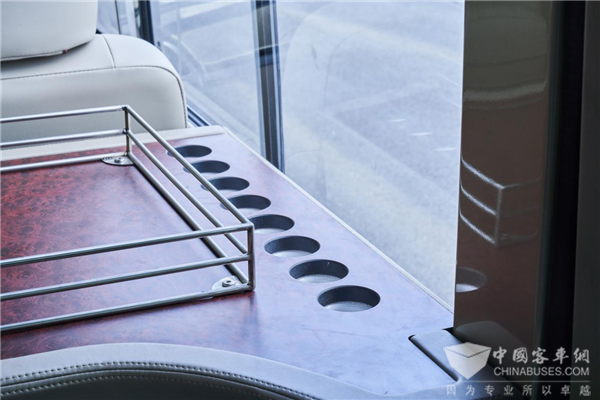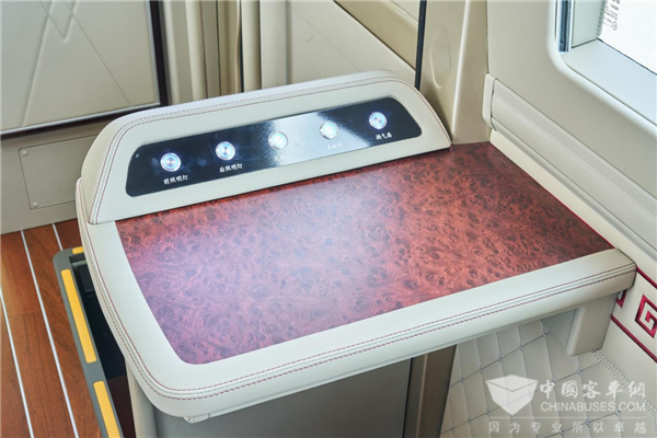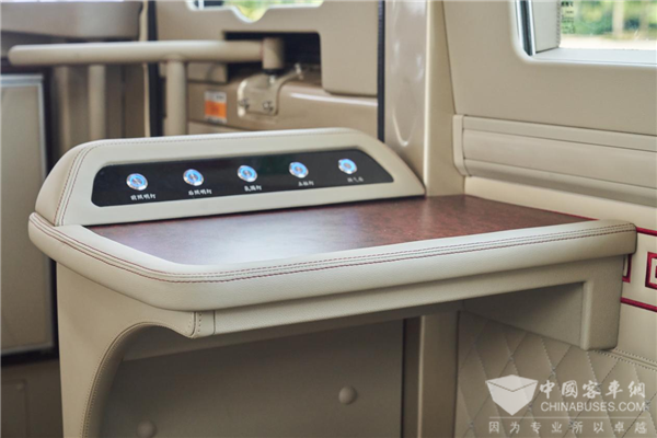 靠近车门的座椅位置是为秘书或助理而留,方便他们最后上车、最先下车。同时还放置一个设置有集中控制系统的木纹书桌,可以控制车内灯光、空调等设施,方便为车内人员提供及时的服务,也可以随时在上面办公。