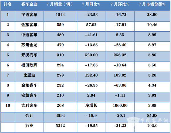 宇通夺冠 金旅榜眼 开沃逆势领涨 7月大中型客车销量遭“双降”