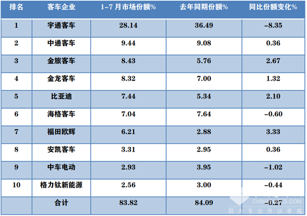 上表显示,在2022年1-7月大中客车Top10市场份额及同比份额变化情况: