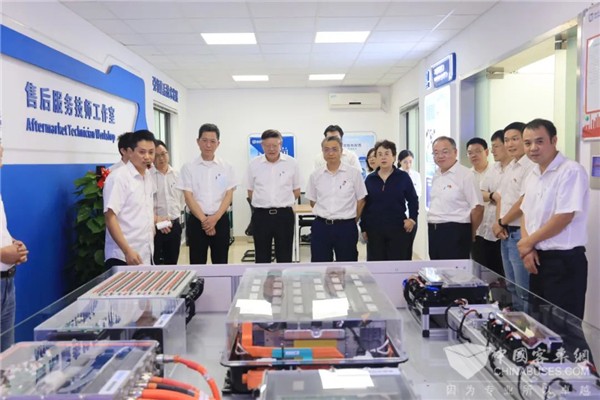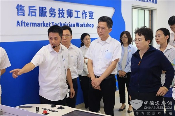 公司领导一起参观了技师工作室,听取了工作室的相关介绍,观看了“纯电动公交客车维修应用实操平台”的应用演示,并与工作室成员等一起合影留念。