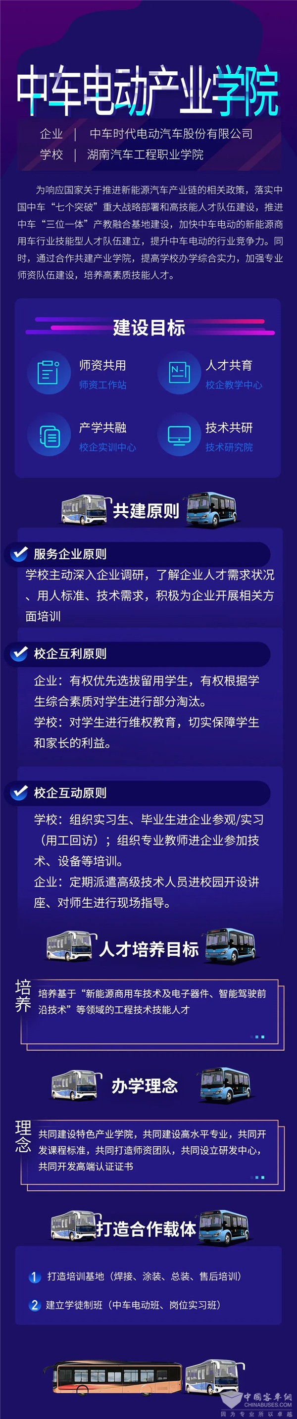 为推进中车“三位一体”产教融合基地建设,中车电动与湖南汽车工程职业学院联合打造了3400平方的教学实训场地,产品配套设备齐整先进。双方再次携手在优势互补的基础上深度合作,共同建设中车电动产业学院,实现“四共”模式的产教新融合。中车电动以创建国家级生产性实训基地、产教融合示范单位为目标,切实建设好产业学院,立志打造成为中车校企合作标杆。