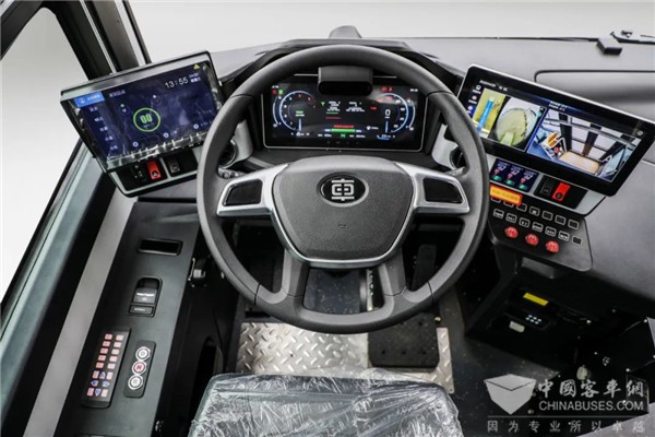 按照中车极简设计理念布局仪表台、设计驾驶模式,随动仪表台和中置全液晶显示仪表,搭载整车360环视系统,可有效减少视觉干扰,同时消除驾驶员视野盲区,降低驾驶员劳动强度;采用“单踏板驱动+离座传感器”控制逻辑,可简化驾驶操作流程,让驾驶更加轻松方便。