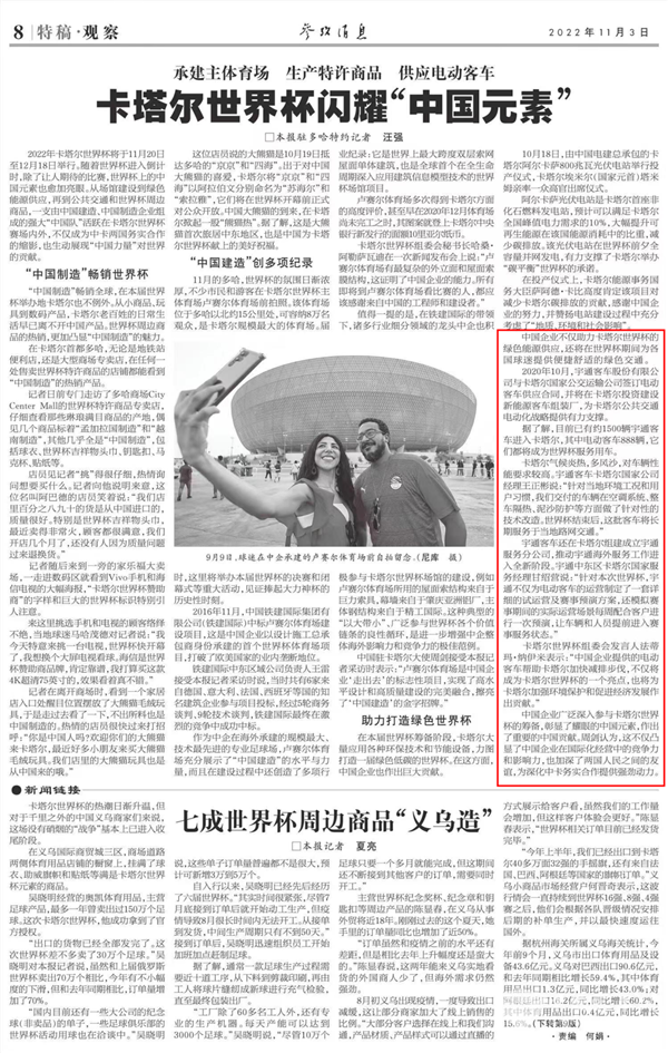 随着世界杯进入倒计时,除了让人期待的比赛,世界杯上的中国元素也愈加亮眼。近日,新华社《参考消息》对卡塔尔闪耀的“中国元素”进行了大篇幅主题报道。从场馆建设到绿色能源供应,再到公共交通和世界杯周边商品,一支由中国建造、中国制造企业组成的强大“中国队”活跃在卡塔尔世界杯赛场内外,其中将有1500台左右的宇通客车为本届绿色世界杯提供运输保障工作,这是宇通继CCTV《新闻直播间》、《朝闻天下》等新闻栏目报道之后,再获聚焦。