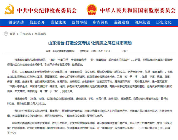 据了解,为营造“抬头见廉”的浓厚氛围,引领崇廉尚洁的良好风尚,烟台市纪委监委联合烟台市公交集团推出了“清廉烟台号”公交专线。