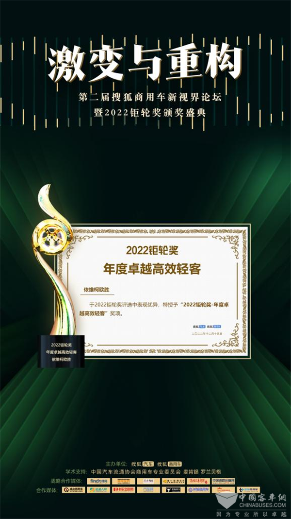 为更好地记录商用车技术革新、产品进步以及产业升级,搜狐举办“2022钜轮奖”用以表彰在过去一年中不断追求进步、努力引领行业的商用车企业和产品。依维柯欧胜以“年度卓越高效轻客”奖项荣誉加冕,不仅彰显了南京依维柯出色的品牌影响力和强大的产品实力,也鼓舞着南京依维柯以科技为依托,创新为动力,走可持续发展之路,不负用户与行业的信任!
