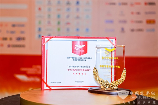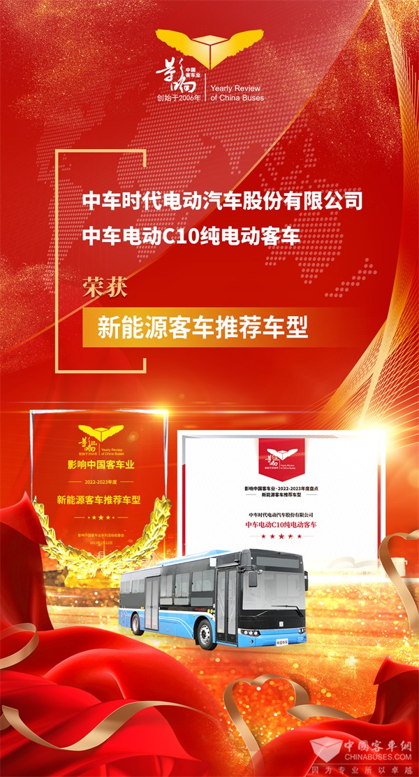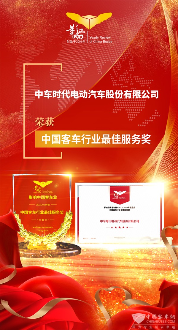 2023年2月22日,第17届影响客车业年度盘点颁奖典礼在南京举行。活动当晚,评选结果新鲜出炉,经过影响客车业专家委员会综合评定与网站读者公示投票,中车电动从诸多申报单位中脱颖而出,摘得2022-2023年度“客车行业最佳服务奖”、“新能源客车推荐车型”两项大奖。