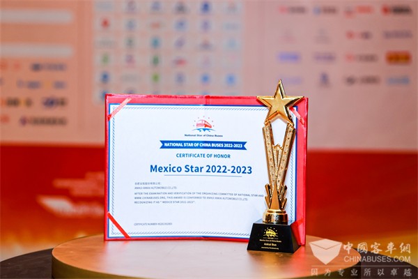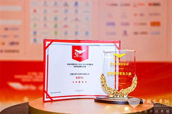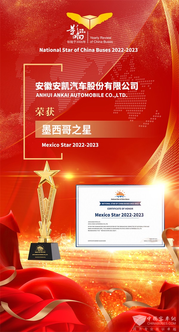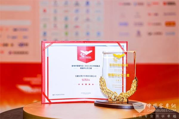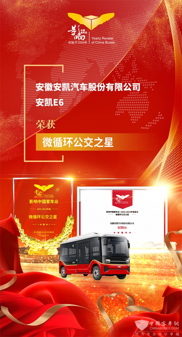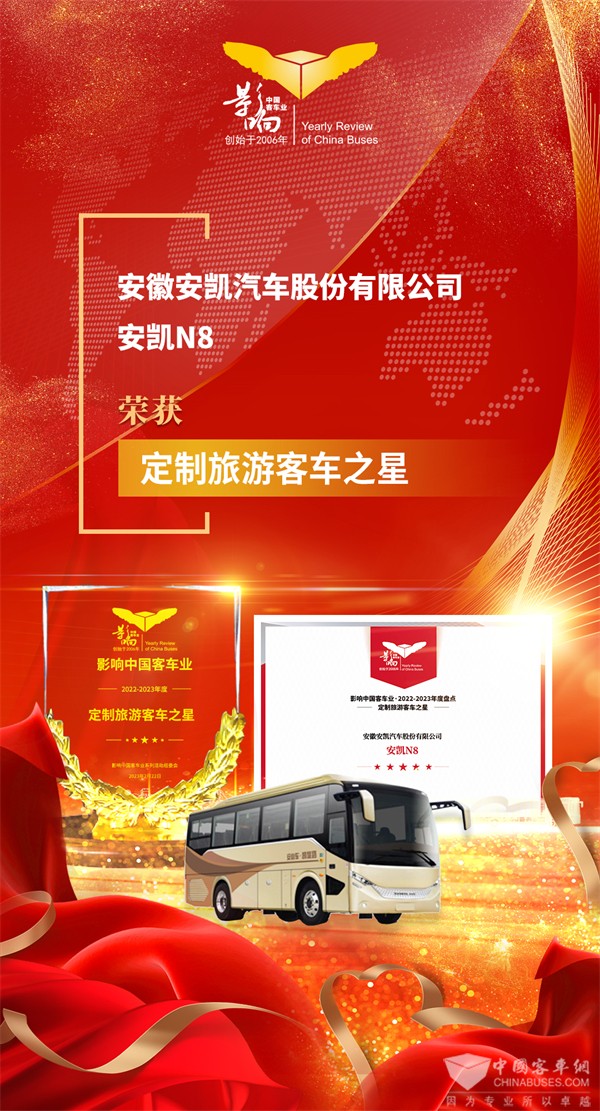 2023年2月22日,第17届影响客车业年度盘活动南京举行。活动当晚,影响客车业年度盘活动评选结果证实揭晓,安凯客车荣获2022-2023年度“定制旅游客车之星”、“微循环公交之星”和“墨西哥之星”三项大奖,凭借着过硬的产品力和海外影响力领跑客车细分市场。