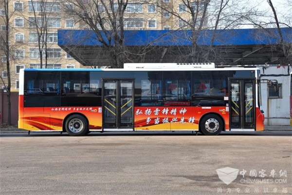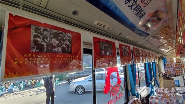 整车车身,以彰显奉献的红色为主基调,车内增添雷锋元素,使“弘扬雷锋精神 争当振兴先锋”等主题标语醒目又不失单调。充分利用公交车身、车内灯箱、挡板、座椅和顶棚展示雷锋精神,传承红色基因,成为沈阳街头一道亮丽的风景线。