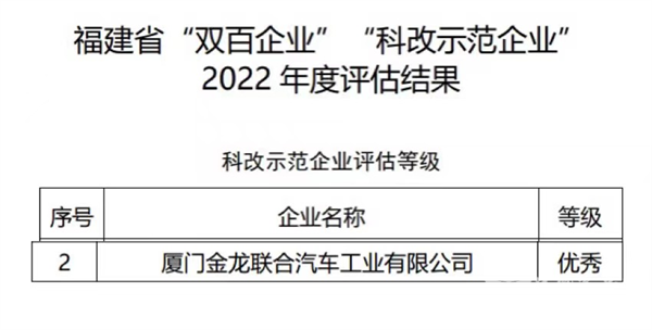 2023年3月,厦门金龙联合汽车工业有限公司在国务院国有企业改革领导小组的2022年“科改示范企业”专项评估中获评“优秀”。金龙客车入选“科改示范行动”企业三年来,两次获得“优秀”,这是金龙客车深化改革举措的重要荣誉,其成果也频获肯定。