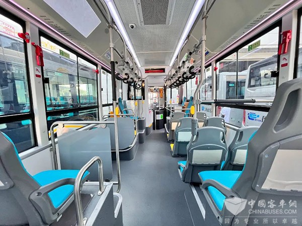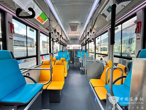 内饰座椅采用“橙、蓝”配色,更显青春活力。另外,近10米的车内空间,同时乘坐50人也不会拥挤。