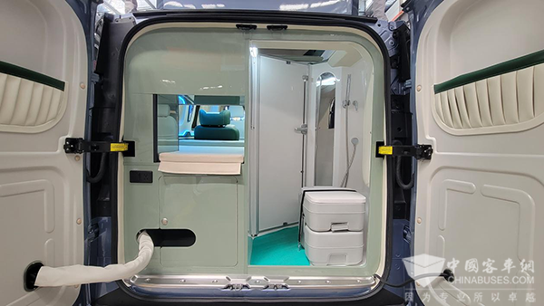 紧挨纵置床的一侧是固定式卫浴间,采用后开阔式设计,具备多功能使用,配备便携式移动马桶、淋浴花洒,整体可实现旅行应急如厕、洗漱,也可作一个单独的储物空间。