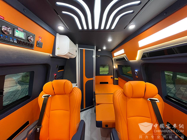 走进车内,聚星房车结合了商务车和房车的元素设计,整车内采用爱马仕橙和普鲁士蓝的搭配,充满霸气总裁范。聚星房车荷载6人,配备了2张航空座椅,可实现通风、按摩、加热功能,以及手机无线充电,非常智能舒适。路途中坐在航空座椅上不仅可以追心爱的电视剧或电影,还可以把主副驾背后的小桌板打开,出差也不耽误办公;而当你感到疲惫时,随手将后面座椅卡座一放,秒变1850*800MM的床,躺下休憩,十分惬意;再配合双侧开门设计,可左右两侧上下乘客,能够充分多人出行场景,为用户提供更方便灵活的用车体验,商旅感十足。