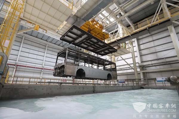 “电泳是当今全球乘用车和客车外观防腐的首选工艺,重庆中车恒通电泳线采用全球通用的整车阴极电泳、国内外最先进的生产设备,是一条集绿色、环保、科技、人文为一体的生产线,也是西南地区最大的一条‘硅烷’客车电泳生产线。”重庆公司综合管理部部长毛军介绍,和传统工艺相比,电泳工艺具有设备先进、工艺完善、自动化高、节能环保等特点,整车耐盐雾性能可达到1000小时以上,是传统工艺防腐能力的5倍左右。另外,输送系统可自动化控制,能一键自动化运行。