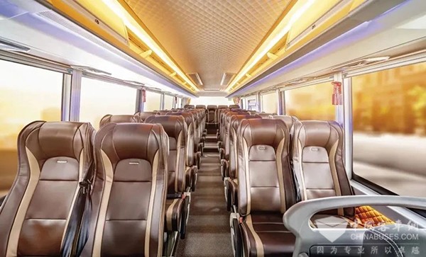 乘客座椅使用豪华高靠背航空座椅,采用软滑柔韧的皮料,更贴合人体曲线,躺靠在座椅上小憩,扫去一身的疲惫。通过使用动车窗帘、电动前挡遮阳帘,阳光扑面或闭目养神都随心。