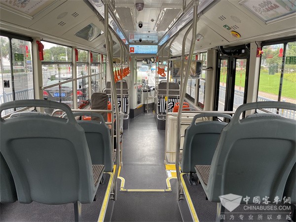 底盘方面,海格蔚蓝KLQ6856采用全承载车身结构,高强度钢车身骨架,可搭载行业领先独立悬架轮边驱动桥,电机功率密度及扭矩密度上大幅优于直驱电机。在智能化配置上,海格蔚蓝KLQ6856搭载了更为完备的主被动安全驾驶系统,全方位保护司乘人员安全。同时,车辆还标配了G-BOS智慧运营管理系统,通过能耗精准管理、不规范驾驶行为AI识别、远程控制、远程诊断等功能,能够在日常经营中帮助公交客运企业进行数字化赋能,降低运营成本。