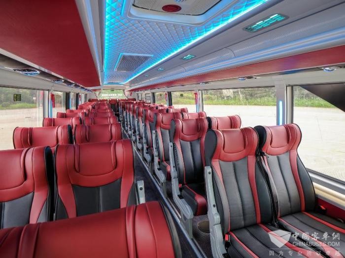 外观造型上,海格蔚蓝KLQ6856车长8.5米,前脸采用极具辨识度的大V造型,银黑蓝三色搭配,科技感十足,极具视觉冲击力。车内采用低地板前后开门布置,色彩搭配新颖,设有LED氛围灯,可营造更加温馨愉悦的乘车体验。全部通道无台阶的设计,增加了车辆站立面积,使得最大载客达到80人,为行业最高。