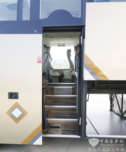 中通H11主打旅团客车市场,行李舱空间自然丰裕。打开车身侧面的舱门,大尺寸储物舱口映入眼帘,方便拿放背包和行李箱。大尺寸行李舱设计,可携带更多旅客物品,保障装载性能。