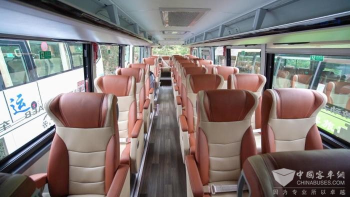 中通H11车辆内部基于中通旅团客车5A级健康座舱技术积淀,应用空气清新、抗菌防霉健康内饰,保证乘客出行安全健康与舒适,满足乘客美好出行期盼。