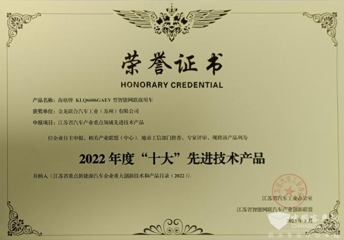 2023年11月17日,江苏省车联网和智能网联汽车产业创新发展大会在南京召开。会上公布了“江苏省汽车产业重点领域先进技术产品”奖项,苏州金龙KLQ6606GAEV无人驾驶巴士荣获年度“十大”先进技术产品奖,该款车型也同时被纳入《江苏省重点新能源汽车企业重大创新技术和产品目录(2022)》。