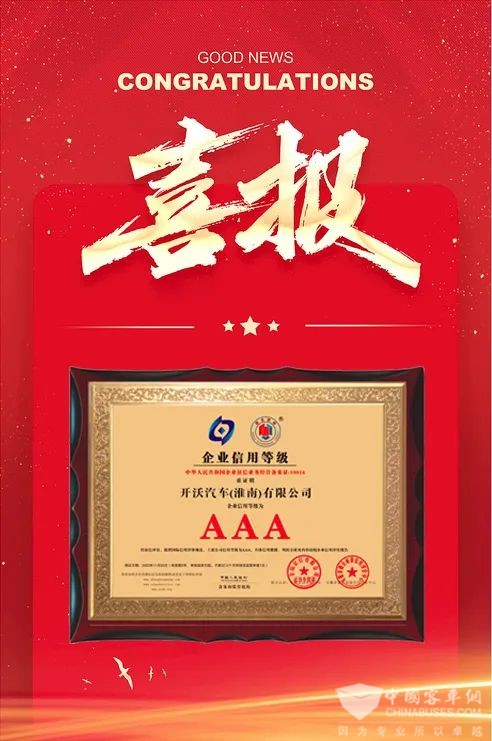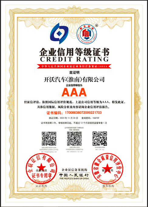 未来,淮南开沃将持续保证企业的信用记录、管理能力、经营状况、企业竞争力、社会形象、财务状况、顾客满意度、发展前景等项目的处在行业前列,持续打造良好的品牌形象、极高的品牌认知度与社会美誉度,把信用建设融入到企业发展的进程中,用守信态度与客户真诚合作,不负“AAA级信用企业” 这实至名归的荣誉,为淮南汽车产业诚信发展做好带头作用。