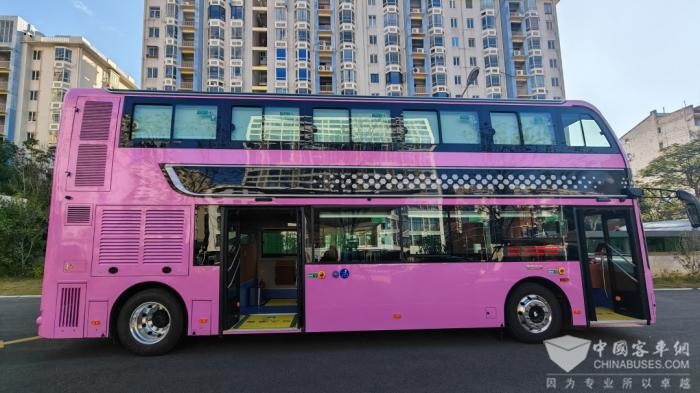 粉嫩的“双层观光巴士”,拥有全景天窗、KTV影音系统、氛围灯及车身灯带等多项豪华配置。一层车内顶棚印有泉州特色景点老君岩和东西塔的图案,二层的窗户玻璃里刻有十幅世遗景点图,整车处处体现泉州经典印记。