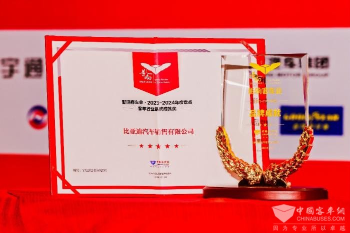 在近日举行的第十八届影响客车业年度盘点颁奖典礼现场,比亚迪商用车凭借在2023年的优异表现,成功斩获了2023-2024年度“客车行业品牌成就奖”。比亚迪再次蝉联这一客车领域影响力极强的大奖,充分展现了其在商用车领域的影响力和突出贡献。