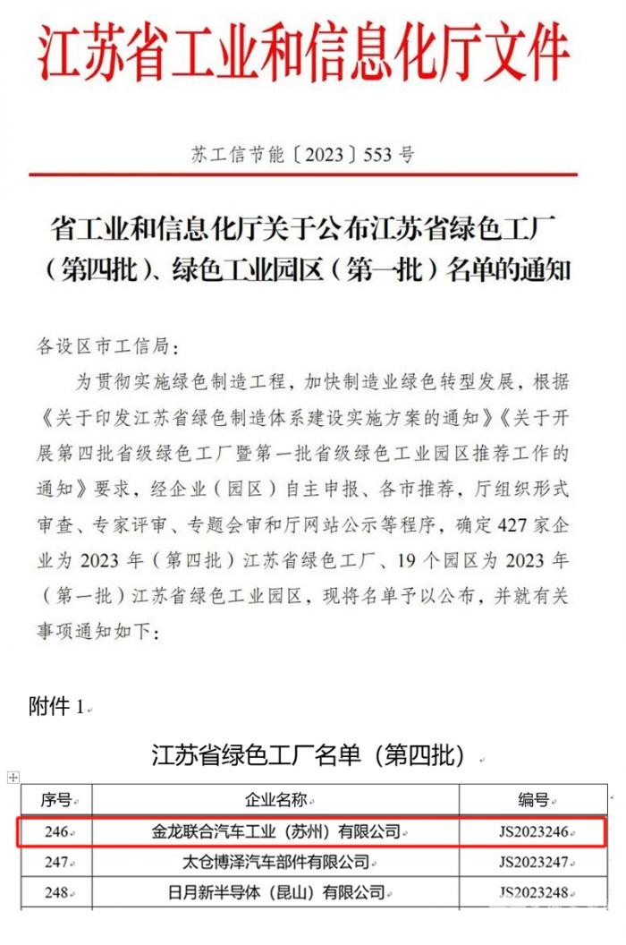 新年有新喜,苏州金龙凭实力再获新荣誉。日前,江苏省工信厅公布了2023年江苏省绿色工厂名单,苏州金龙荣耀上榜,获评“绿色工厂”。这标志着向“绿”而动、踏“绿”前行的苏州金龙正踩准时代的节拍,跑出“双碳”征程加速度。