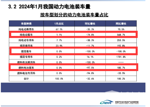 表1:根据截图1中的中国汽车动力电池产业创新联盟数据,2024年1月我国新能源客车在新能源汽车市场中装机量同比及占比: