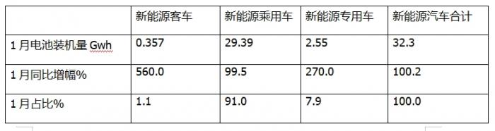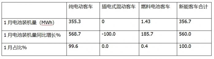 一、1月我国新能客车动力电池装机量同比暴涨5.6倍,领涨新能源汽车大盘,是新能源汽车中占比最小的细分车型
