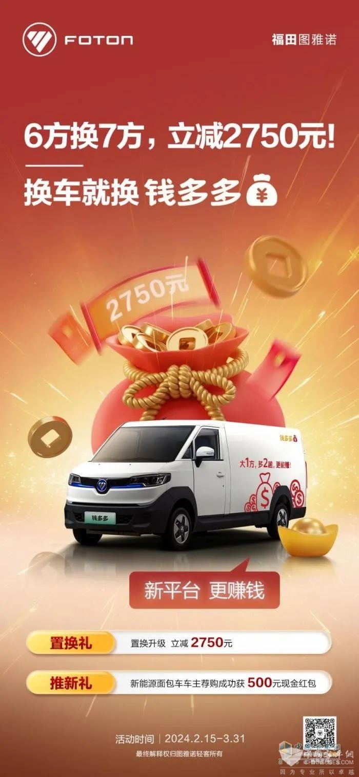 经验上看,选择大品牌相对更有保障。比如福田图雅诺,作为国内轻客领军品牌,其在2023年的累计销量同比增长84.6%,精灵智蓝E7与风景智蓝G7的热度持续不减。此外,图雅诺与中国邮政、德邦、顺丰在新能源领域的合作在今年也迎来了爆发。甚至,在当下极为火热的新能源轻客市场,图雅诺也有所作为,推出“大1方,多2趟,更能赚”的新能源面包车——钱多多,不断完善新能源产品矩阵,坐实新能源轻客第一品牌。