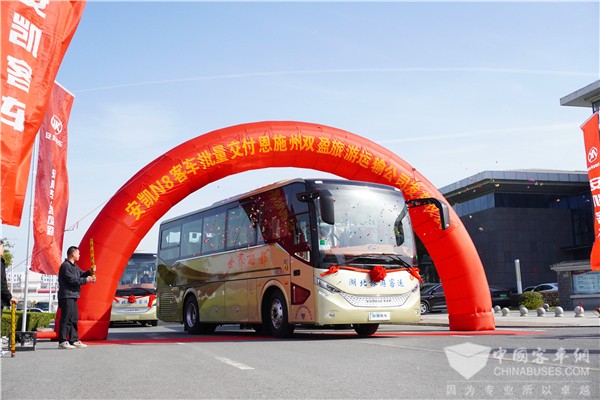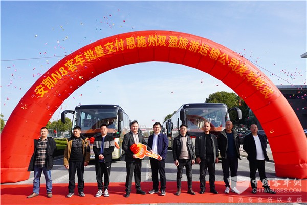 2024年3月21日,恩施州双盈旅游运输有限公司(以下简称“恩施双盈”)再度批量采购安凯N8豪华客车。这批N8客车安全、舒适、高效,投入运营后将有效助力恩施双盈补充运力,以应对即将到来的五一黄金周旅游高峰。