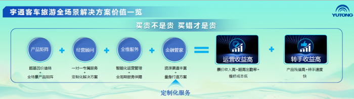 旅游全场景解决方案是宇通客车多年来关注用户需求、聚焦客户体验的智慧结晶。其中,产品矩阵:宇通已实现5-13米全米段、7-56座全车型布局;经营顾问:宇通精准识别客户运营场景与真正需求,可提供销售、交付、使用全程服务;全维服务:宇通拥有一站式服务保障解决方案,并可提供智慧运营管理解决方案,保障客户运营更高效,效益更长远;金融管家:宇通满足客户个性化、差异化的融资需求。