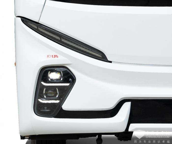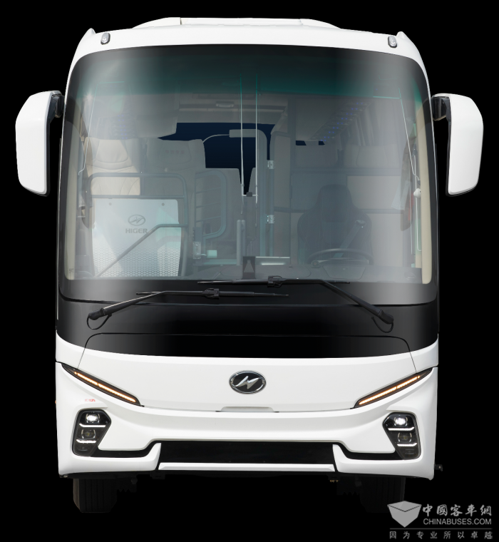 前围面板和前后保险杠均采用高精度复合材料,比冲压钢板轻28.5%,维保更轻松。除霜器、雨刮电机安装在车外,大幅提升维修便利性。值得注意的是前AEB毫米波雷达不再外露,与海格车标Logo相融合,前脸更简洁美观。