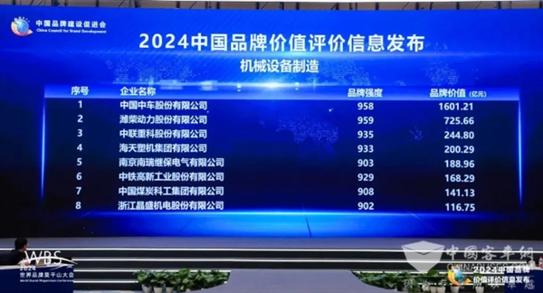 2024年5月11日,“2024中国品牌价值评价信息”在中国品牌日系列活动中正式发布,中国中车以1601.21亿元品牌价值,蝉联中国机械设备制造领域品牌价值榜首,品牌强度958,入选首批“品牌发展良好行为组织”名单。