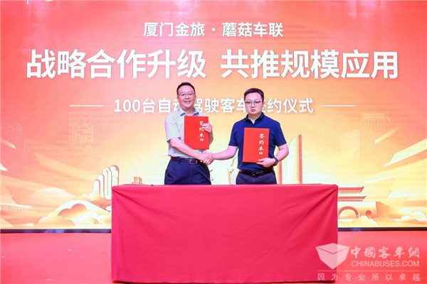 为进一步推动自动驾驶技术研发及运营推广,会上,金旅客车与蘑菇车联举行100辆自动驾驶产品签约仪式。