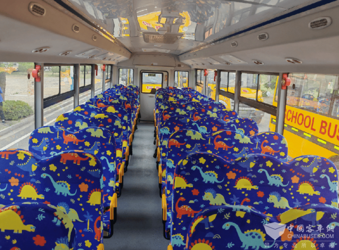 车内材料均采用环保材料,安全环保无异味,采用校车专用座椅阻燃面料,软包扶手,为孩子们提供安全、舒适的乘车环境。